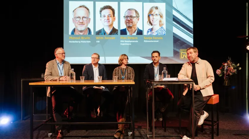 Na het plenaire openingsgesprek volgde de opname van de tiende aflevering van In groen beton gegoten. Vier bekende stemmen uit eerdere afleveringen van de podcast schoven aan: Marcel Bruin (Heidelberg Materials), Pim Peters (IMD Raadgevende Ingenieurs), Sonja Fennis (Rijkswaterstaat) en Wim Jansze (VBI). Zij gingen met elkaar in discussie over stellingen die Harm Edens voorlegde.